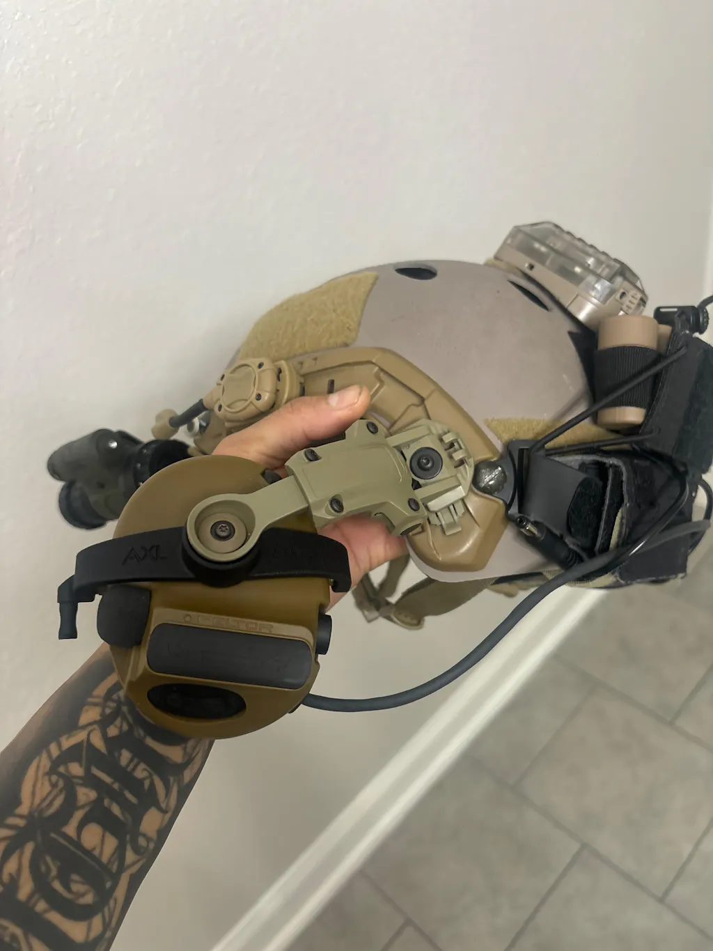 The AMP Arms allow mounting to the rear of Ops-Core ARC Rails, leaving the top portion of the rails free for accessories like lights and cameras. This design enhances helmet stabilization and creates a counterbalancing effect for forward shroud-mounted devices like night vision.